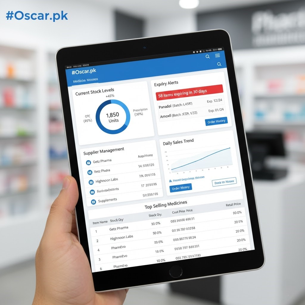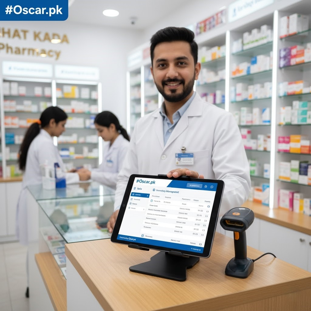 Pharmacists in Pakistan use dedicated pharmacy management systems like Oscar, which handle inventory, billing, and patient data efficiently.