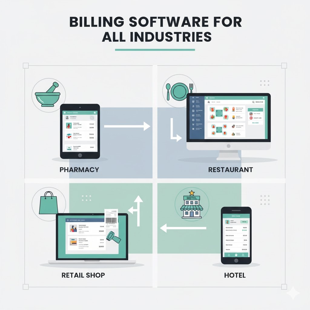 Restaurants and cafés benefit from billing software for restaurant systems that combine menu management, table ordering, and invoice generation.